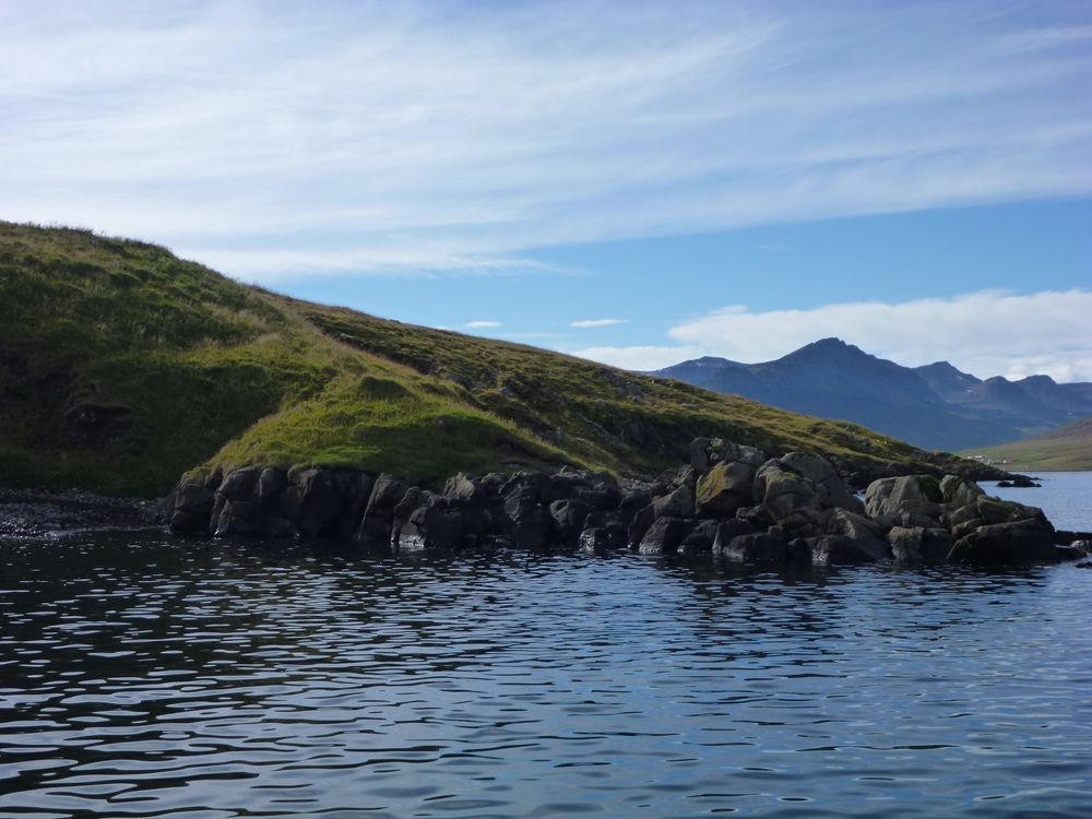 Búlandshöfn á miðju Búlandi. Mótar fyrir sjávargötu. Rústir á tanganum og ofan við glittir í stórar beitarhúsarústir.
