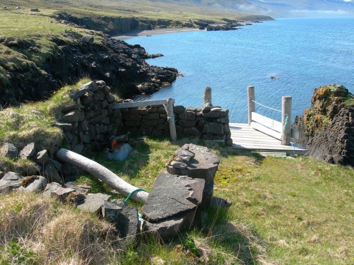 Á þessum tíma var ekkert tunglsljós, dimmt í lofti og svarta myrkur yfir nóttina. Um fimm-sexleytið um morguninn hrukku allir upp úr fasta svefni við óskaplegan hávaða. Það urgaðist eitthvað utan í húsinu, en húsið var bárujárnsklætt utan. Það small í bárunum á járninu. — Sjóskrímsli!, sjóskrímsli! — í einu vetfangi ryfjuðust upp og urðu ljóslifandi alls konar sjóskrímslasögur. Pabbi fór niður. Ég held að hann hafi gripið með sér í ganginum allstóra eldiviðaröxi og svo fór hann út í myrkrið og gekk kringum húsið, en hvorki sá né heyrði neitt, en við heyrðum þessi læti meðan hann var á leiðinni niður stigann. Svo, eins og hendi væri veifað datt allt í dúnalogn og varð steinhljótt, en var bara á norðvestan kaldi.