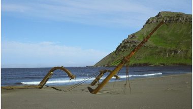 Árið 1966 strandaði síldarskipið Gesina frá Kopervik í Noregi á miðjum sandi í Sandvík. Tólf manna skipshöfn bjargaðist öll. Gesina strandaði 1966. Þessi mynd er frá 2003 þar sem sandurinn er á góðri...