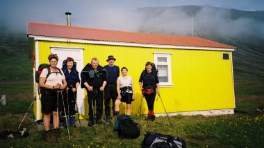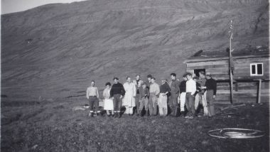 Ferðfólk við verbúðarústir á Skálum Skálaklappir eru ágæt afköst austan megin í Skálabás. Þar var gert að afla og hann saltaður, en fluttur á Norðfjörð til þurrkunar, meðan Norðfirðingar gerðu út frá...
