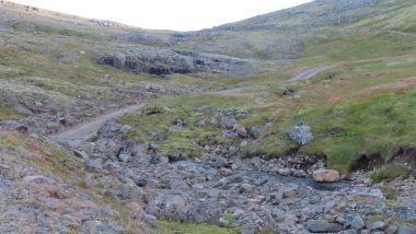 Lagt er af stað upp hlíðina utan við Sandvíkurpart. Slóðinn sveigir til vinstri undir Bæjarhjalla og liggur skáhallt inn í Kerlingarbotna og þaðan til hægri út í skarðið. Að norðanverðu eru...